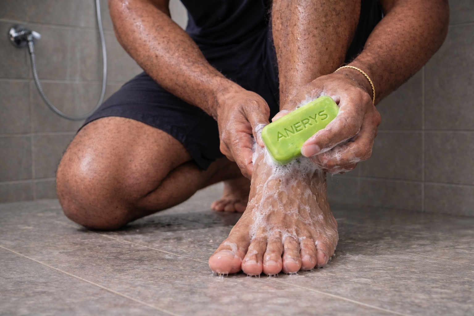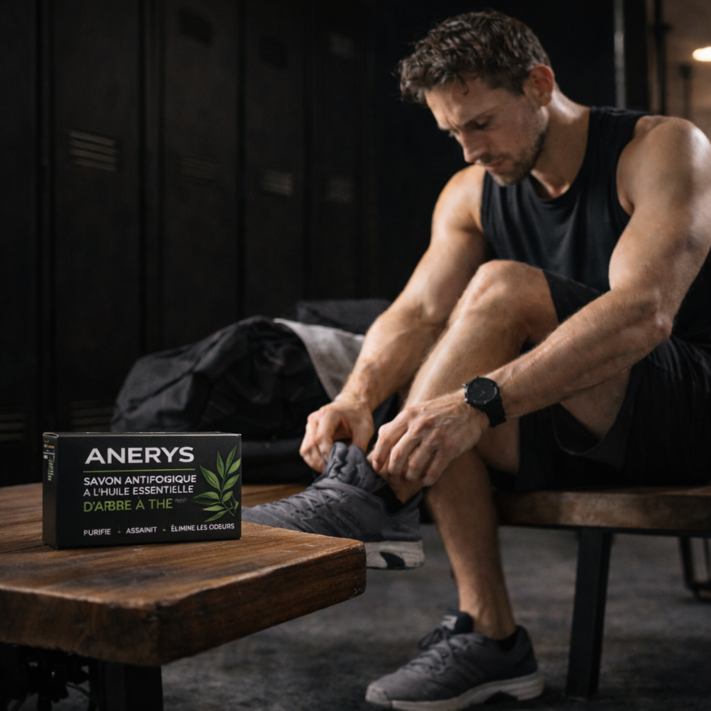Le savon antifongique Anerys pensé pour les sportifs : purifie, assainit et rafraîchit les pieds après l’effort.
